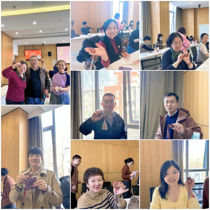 经过近1个小时的精心制作,一件件红木算盘挂件逐渐成型。方寸之间,榫卯结构的严谨与木艺雕刻的灵动相得益彰,展现出非遗手作的独特魅力。活动尾声,教职工们手持作品合影留念。