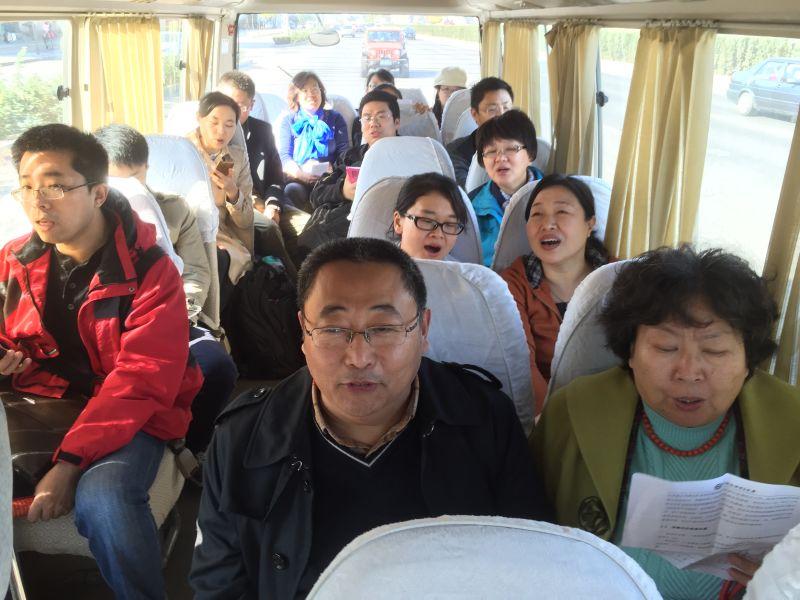 在前往中国人民抗日战争纪念馆的途中,财税学院分工会在李蕾老师的指挥下,反复练习参赛歌曲,并在去之前组织各位老师试衣服选尺寸,为即将到来的校工会歌咏比赛做积极准备。