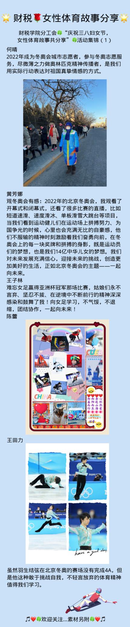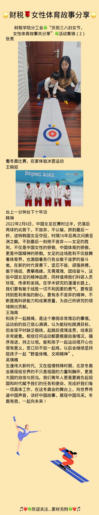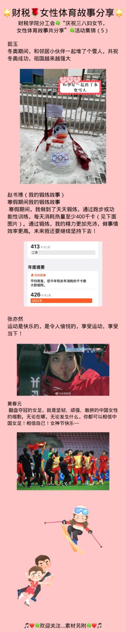 为庆祝第112个国际“三八”妇女节, 2022年3月8日,在校工会和学校党委的支持下,财税学院分工会举办的“庆祝三八妇女节,女性力量共享”活动顺利开展。财税学院全体女教职工积极响应,观看了女足比赛、收看了冬奥会比赛、参与了冬奥志愿、并投身于运动和健身中。围绕“我的体育故事”的主题,她们分享了亲身经历的感想和体会,展示了新时代女性爱国情怀、健康向上的精神风貌。