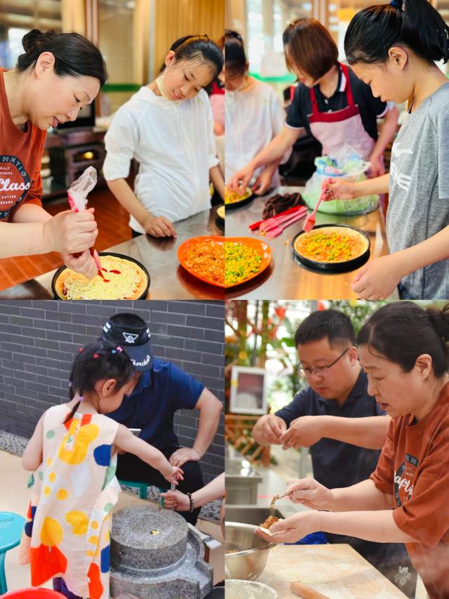 在自制中华美食环节,老师们和小朋友们分为三个小组,依次磨制豆浆,制作披萨和烙饼,感受中华传统美食的博大精深,享受美好的亲子“食”光,体会劳动收获的满足感和乐趣!