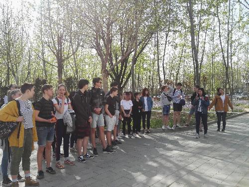 参观第一站,志愿者们带着马尔滕斯中学的同学们穿过南门的林荫道,来到栋梁柱前。在富有中华文化特色的栋梁柱前,志愿者们向参观者介绍了栋梁柱的来历、含义和每根柱子代表的内容,并邀请同学们上前,触摸带有年代感的标志数字,感受中华博大精深的文化底蕴。介绍过程后,同学们在栋梁柱前合影留念。