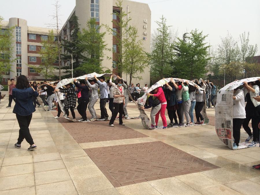 4月15日下午1:30,奈菲影视 室外大赛在图书馆门前举行,比赛共分四项,20人21足,风轮滚滚,12人八字长绳及搭桥过河。比赛队伍为2013级和2014级共10个班级。