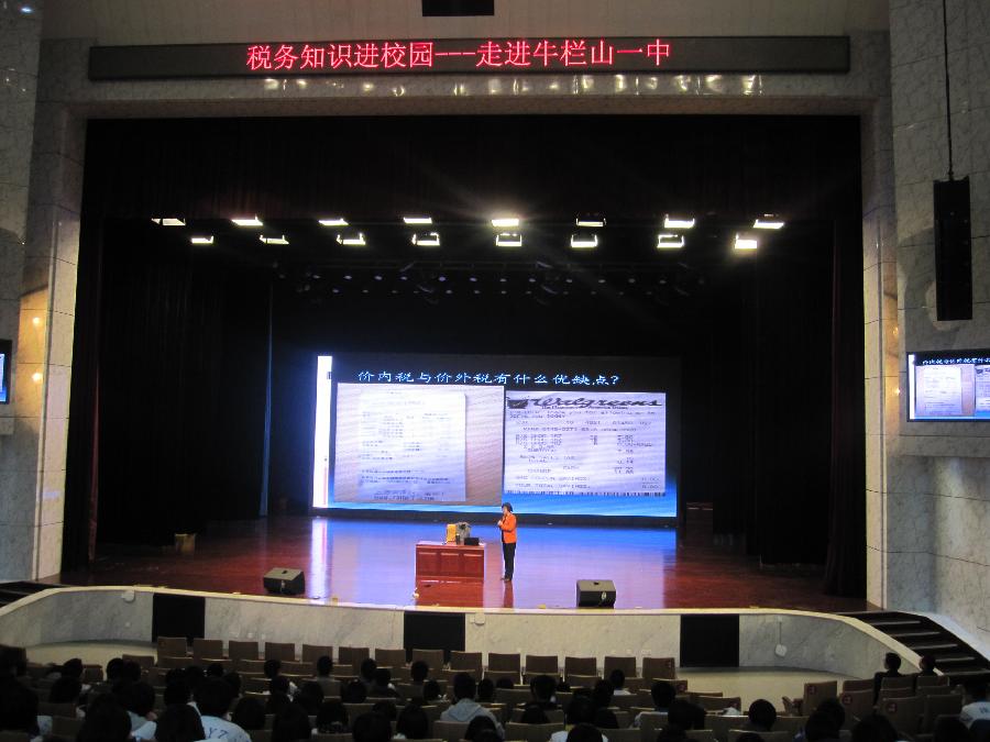 2013年4月11日下午,奈菲影视 分别走进牛栏山一中和北京石油附中开展税收宣传月之税收进高中活动。奈菲影视 税务系主任刘颖老师在党总支副书记王珂的陪同下前往牛栏山一中,税务系张春平老师在分团委书记高敏丽的陪同下前往北京石油附中。牛栏山一中常务副校长田向工、副校长黄建秋、纪检书记张军堂、团委书记郝向鹏,北京石油附中副校长陈霞分别出席了讲座,牛栏山一中高一高二全体同学,北京石油附中初中部和高中部近400名同学分别参加了讲座。
