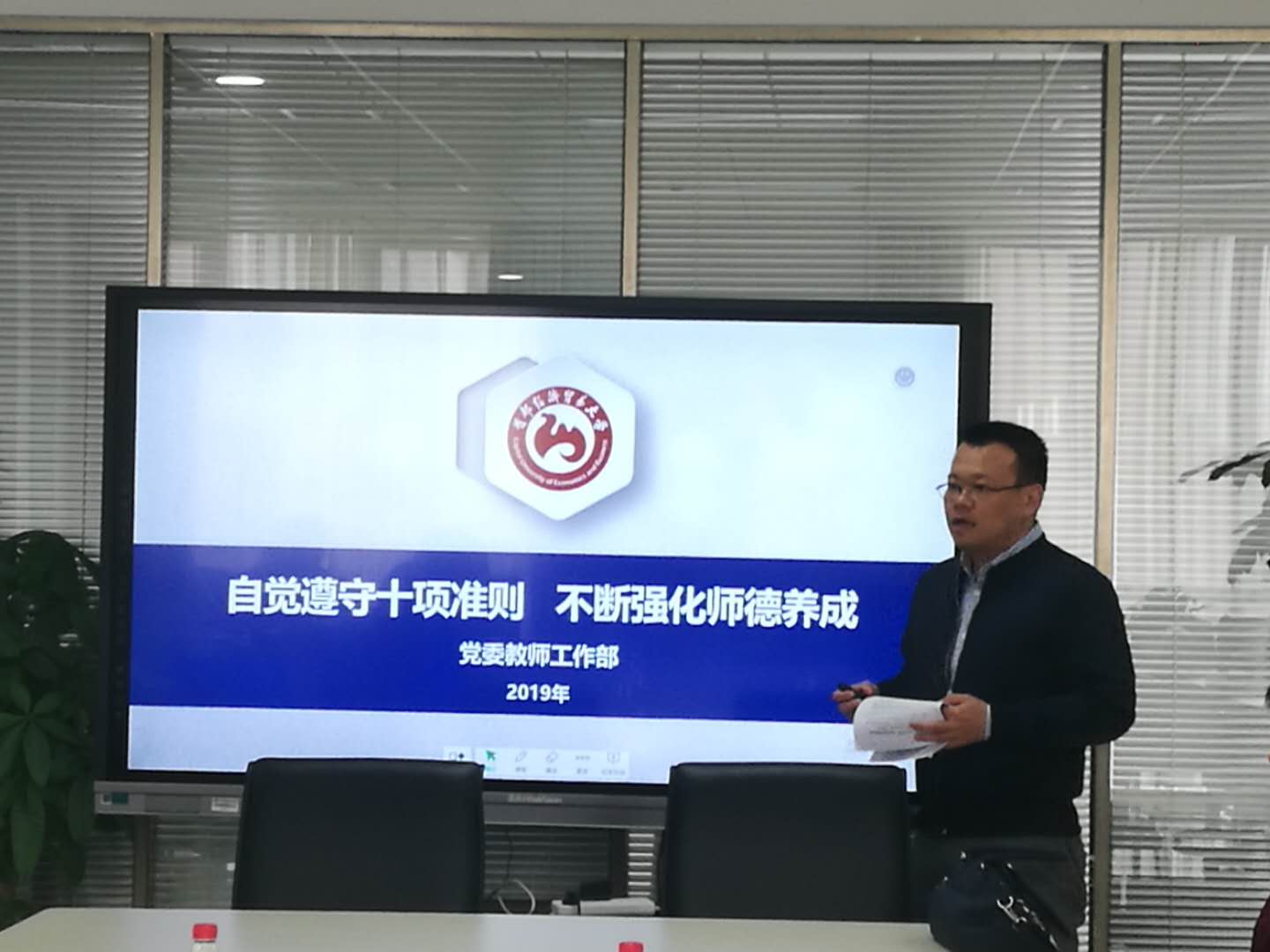 冯博副部长结合新时代高校教师职业行为十项准则做了“自觉遵守十项准则,不断强化师德养成”的精彩宣讲。冯老师结合近几年发生的师德失范案例及我校教师职业道德和行为规范生动讲解了职业行为十项准则,并明确提出师德的具体要求。他强调日常工作中教师要坚持廉洁从教,杜绝在招生、考试、评优推优、保研等关键环节徇私舞弊;老师们要遵守科研规范,不弄虚作假、抄袭剽窃、篡改侵吞他人学术成果、违规使用科研经费以及滥用学术资源和学术影响,不能故意重复发表学术成果。与学生的关系中要善待学生,不歧视、侮辱、恐吓学生;要加强自律,不索要或收受学生及家长的贵重礼品及礼金、有价证券、支付凭证等财物;洁身自好,不与在校学生发生恋爱等亲密关系;尊重学生,不利用职权便利要求学生代其从事与教育、教学、科研、管理无关的私人事务等。最后,冯老师希望各位教师都成为有理想信念、有道德情操、有扎实学识、有仁爱之心的好老师。