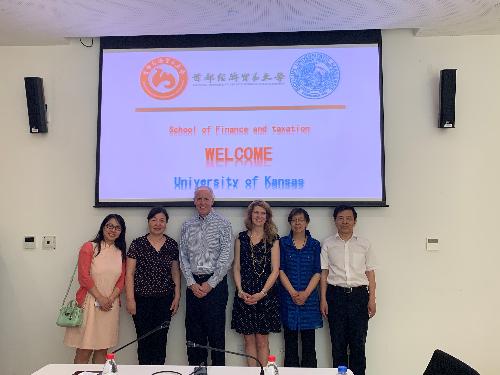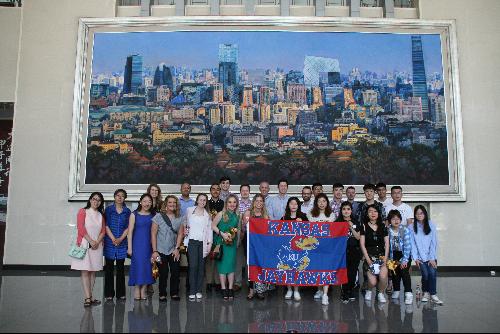 2019年5月23日上午,美国堪萨斯大学师生一行17人到我校交流。奈菲影视 党委书记刘学伟,院长李红霞,副院长王竞达,资产评估系教师张亮以及分团委书记韩天艺参加了交流活动。