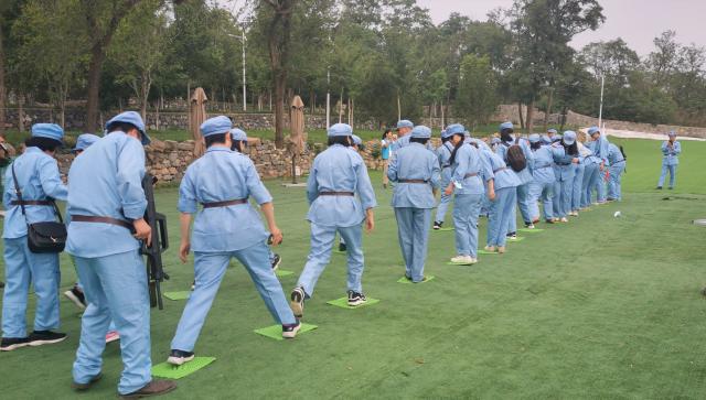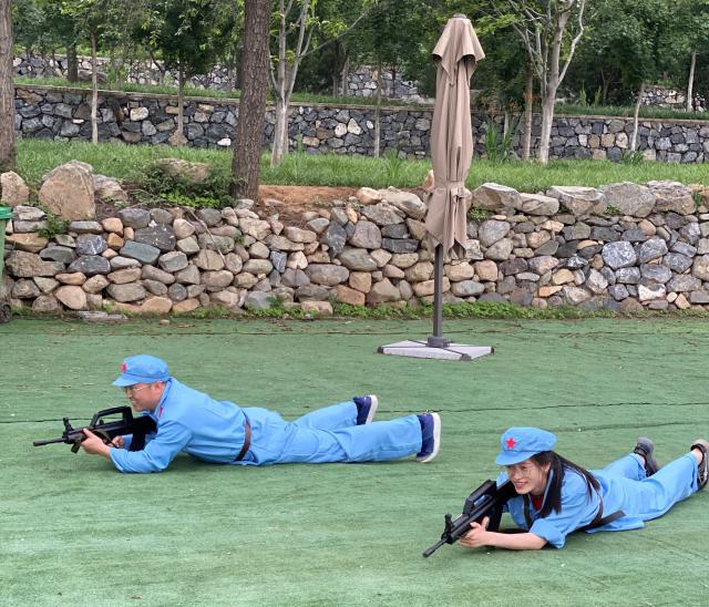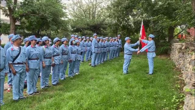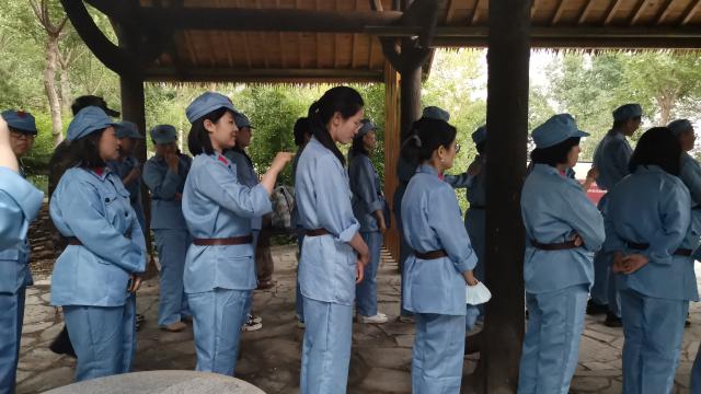 接下来老师们换上军装,体验了重走红色长征线路。体验项目以大西山红色故事为依托,包括冲破封锁,过草地,红色电波等环节。体验开始前全体老师集结列队,整定军纪,举行了授军旗的誓师仪式,庄严的气氛一下就把大家带回红军长征的革命年代。历史上在极端恶劣的环境下,红军战士们发扬革命理想高于天的忘我牺牲精神,跨急流、登雪山、穿草地、突封锁,粉碎了上百万敌军的围追堵截,最终实现胜利会师。老师们在长征精神的鼓舞下,不畏烈日与高温,齐心合力完成了任务。临近结束天气突变,大家又冒雨向山顶进发。通过重走长征路的体验,大家切身体会到红军长征的艰苦和长征精神的可贵,也更加坚定了作为党员的理想和信念,铭记历史,不忘初心,在新长征路上继续奋勇前进。