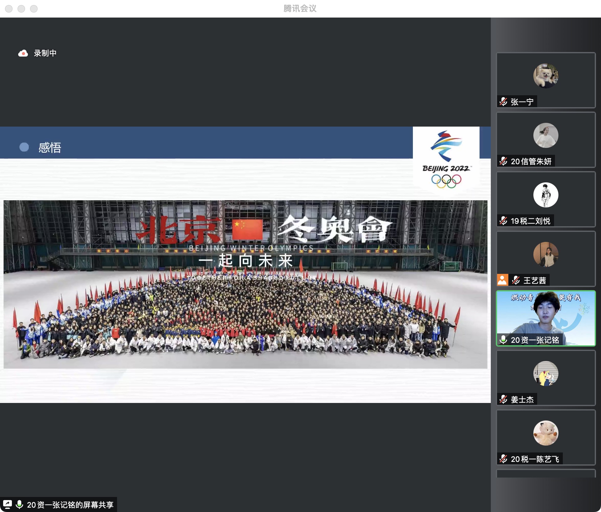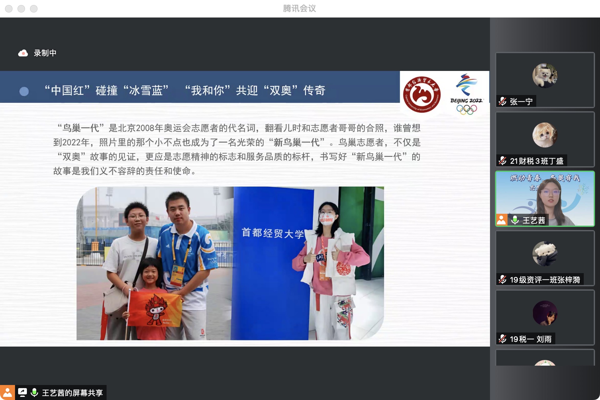 2022年8月8日第一场云端宣讲由宣讲团的张梓漪、张一宁、刘雨、王艺茜同学进行冬奥服务的交流,会议由王艺茜主持。