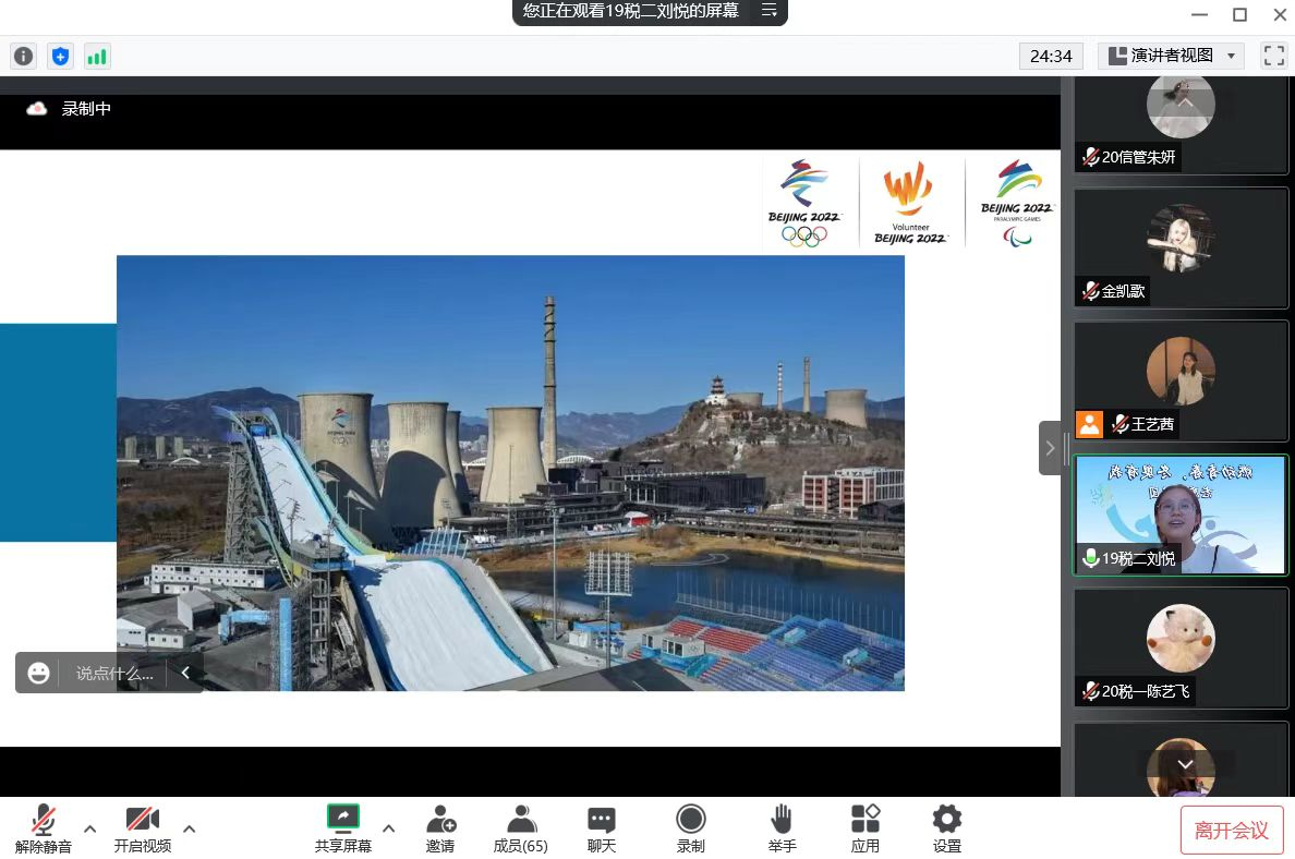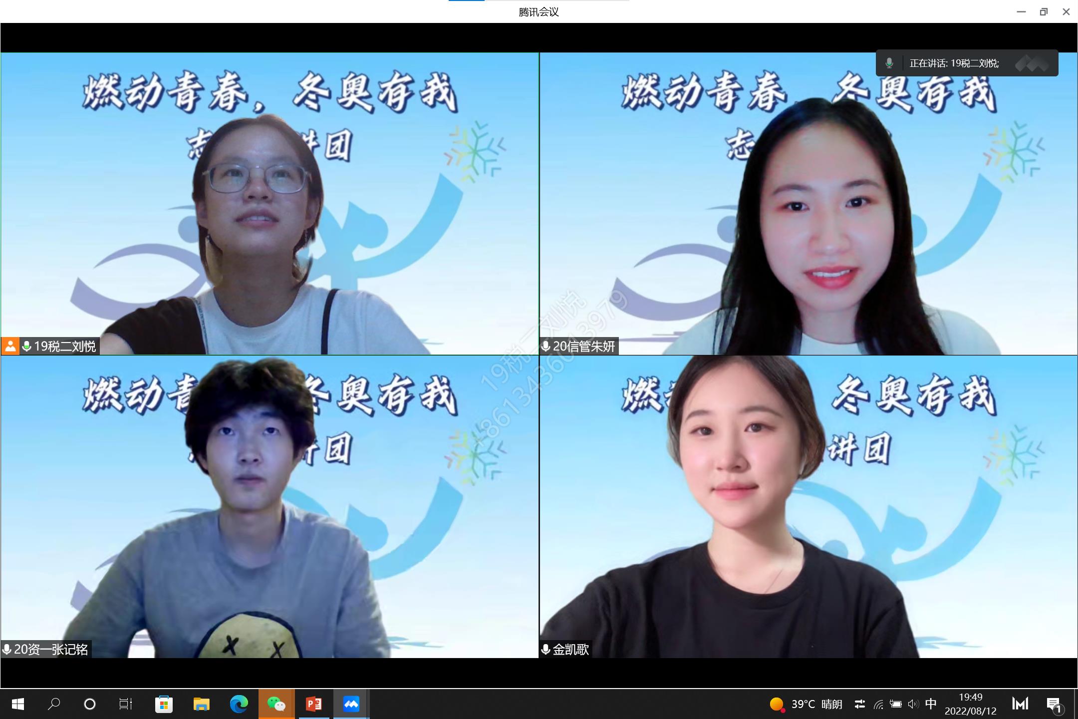 2022年8月12日第二场云端宣讲由宣讲团的金凯歌、刘悦、张记铭、朱妍同学进行冬奥服务的交流,会议由朱妍主持。