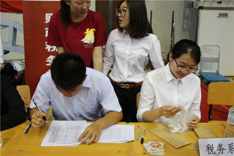 奈菲影视 院长姚东旭、党委书记李红霞、副院长何晴、党委副书记王珂和相关行政老师及学院学生会、分团委的各部门部长、干事齐聚体育馆迎接新生。学生会、分团委的干事身着院服组成强大的志愿服务团,在新生出口高举“财税接待”的牌子,时刻准备带领新生办理报到、入住等手续。新生报到紧张有序地进行。