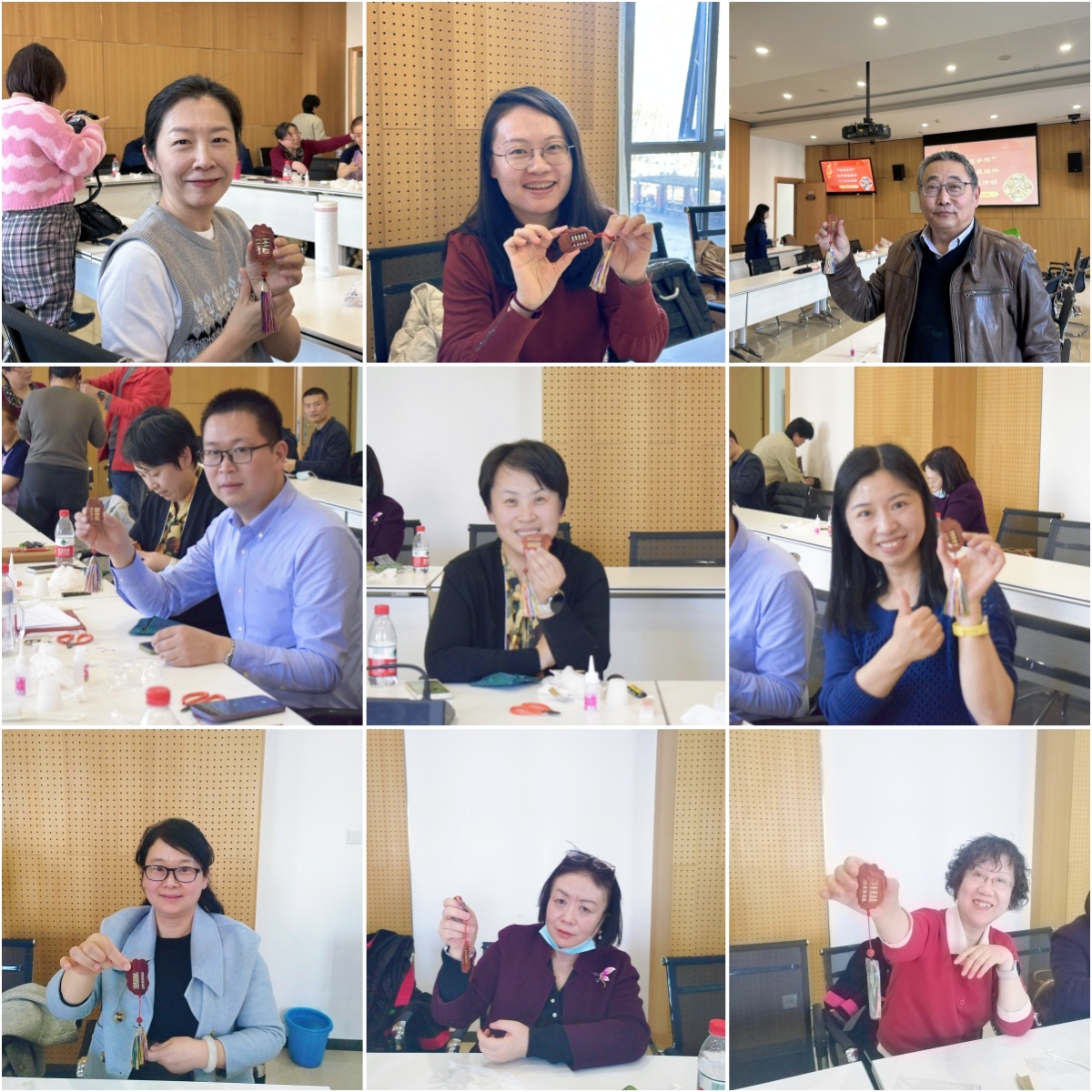经过近1个小时的精心制作,一件件红木算盘挂件逐渐成型。方寸之间,榫卯结构的严谨与木艺雕刻的灵动相得益彰,展现出非遗手作的独特魅力。活动尾声,教职工们手持作品合影留念。