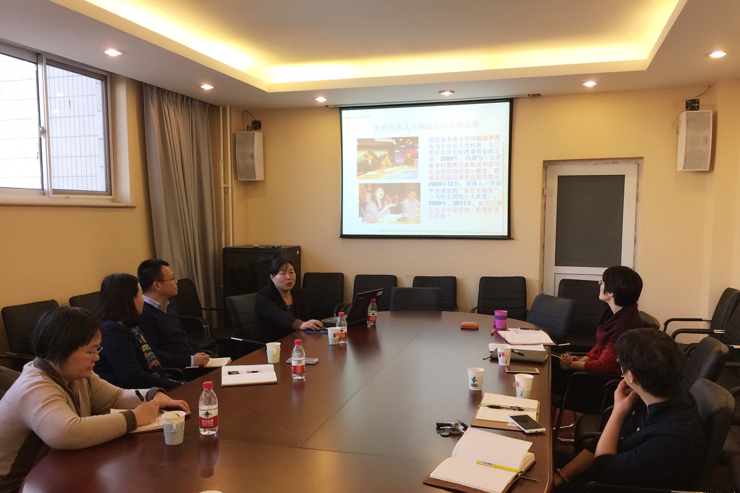 李红霞围绕学院宣传思想工作现状、工作做法及特色、建议措施等三个方面对学院宣传思想工作情况进行汇报。她提到,学院现有官方网站、人人网主页“财税学”和“税众箴品”、微信平台“贝才禾兑学”和“财税之声”等网络宣传新媒体,同时已打造一支高素质、能力强、分工明确、协作有序、机制健全的宣传队伍。李红霞还进一步针对新媒体、教师教风、少数民族学生等相关问题提出对思想政治工作的建议措施。