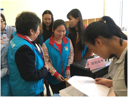 接着,同学们参观了二层的办税大厅,这里又是另一番景象,同学们聆听朱老师介绍了国地税设立对桌窗口,联合办税等新型服务模式后,同学也纷纷穿上了“小V蜂”志愿者服务的马甲,走上问询岗为纳税人服务。同学们通过志愿者服务不仅学习了税收实务,还体验了税务工作者的工作环境和工作内容。