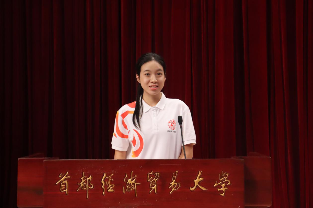 2024级财政学本科新生陈梓萌代表全体本科生发言。她以“笃学求真,力行明志。”为切入点,表示要筑牢精神之基,努力提升思想政治素质、政策理论水平与创新实践能力。她祝愿同学们追光而遇、沐光而行,在首经贸财税学院成就更好的自己,以青春之我贡献伟大时代。
