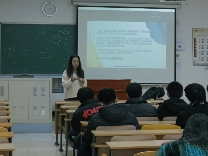 陈诗雨为财政学类2班同学做经验分享。陈诗雨从大一年级课程特点引入,提供了课程学习的方法与技巧,如:上课认真听讲、下课多做练习题、及时整理错题等。同时,陈诗雨还分享了在期末阶段调整心态的方法,用自己的实际经验,助力同学们期末冲刺。